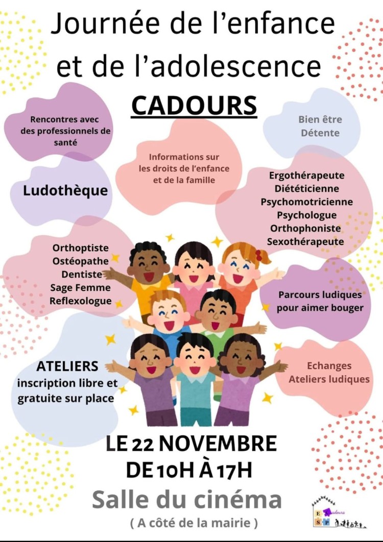 L'ESP (équipe de soins primaires) de Cadours réalise sa première journée de l'enfance et de l'adolescence à Cadours le samedi 22 novembre entre 10h et 17h.