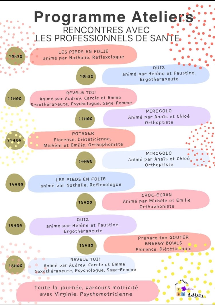 Lors de cette journée de nombreux professionnels de santé seront présents (psychomotricienne, orthophoniste, ostéopathe, dentiste, sage femme, diététicienne,